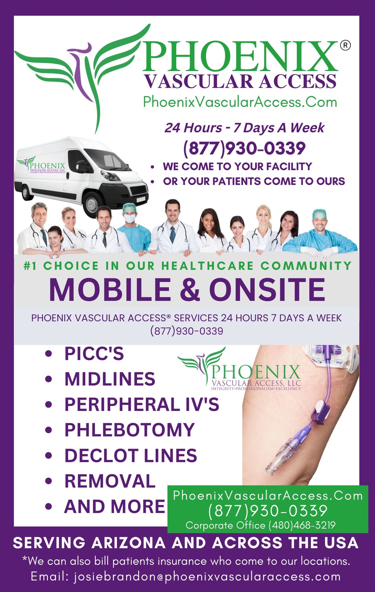 If you are a facility or a patient, give us a call and let's see how we can help you get the service you need today in Scottsdale, Arizona. Phoenix Vascular Access places PICC's Midlines and Peripheral IV's in Arizona and other states.